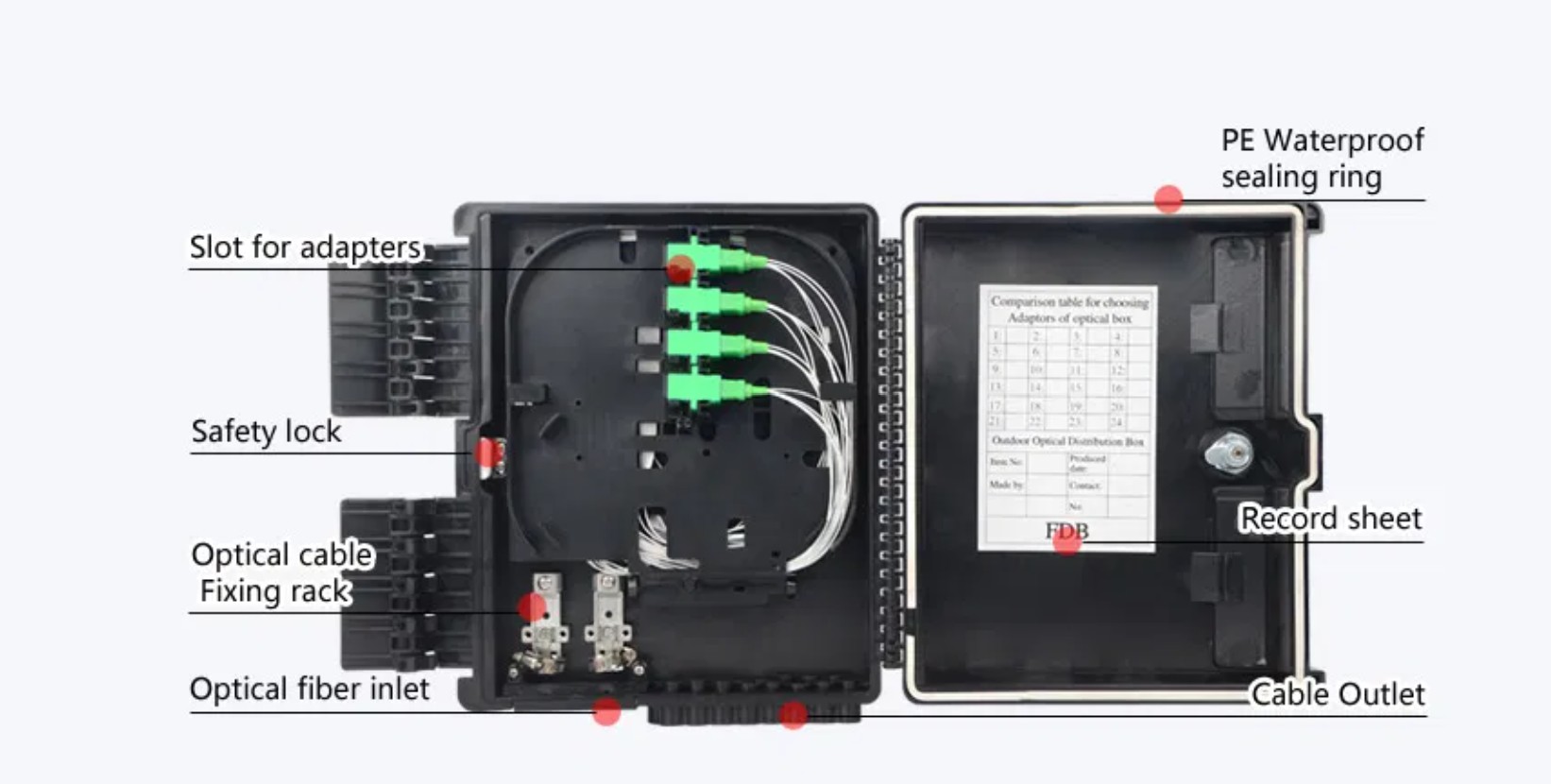 With a weatherproof IP65-rated design, the TX-FDB-04 is suitable for both indoor and outdoor installations. Its compact and lightweight structure ensures easy mounting and efficient network organization for residential, commercial, or small-scale fiber networks.