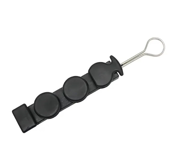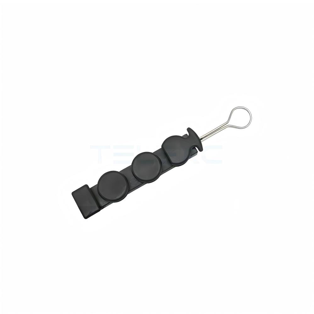 Its insulated plastic body and stainless steel components provide excellent corrosion resistance, UV protection, and long-lasting durability. The self-locking open hook ensures easy installation on poles and brackets, while the groove design tightly secures the cable and messenger. Ideal for dead-end fiber optic cable installations, this clamp supports both round and flat fiber cables.
